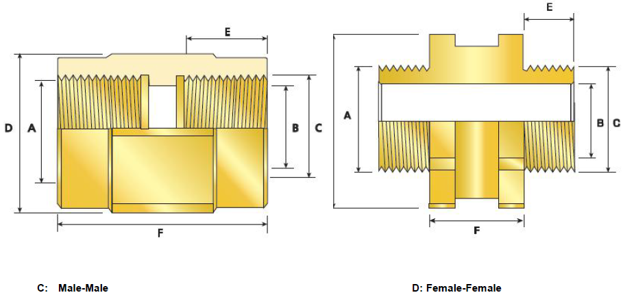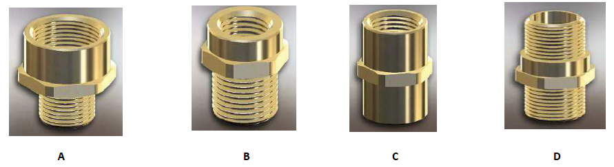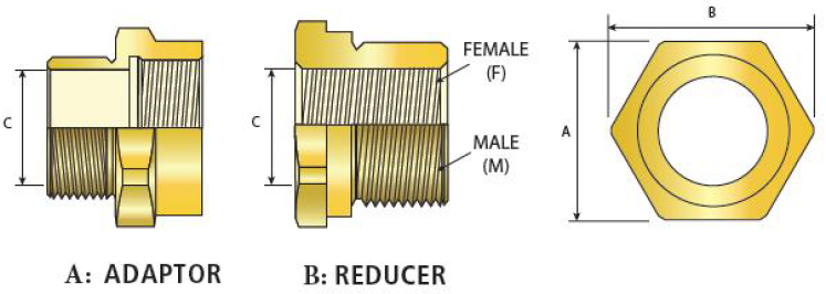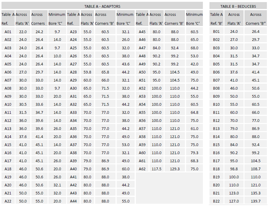 Select the female thread size from the top of Table ‘A’, referenced ‘A**’ for Adaptor and ‘B**’ for Reducer