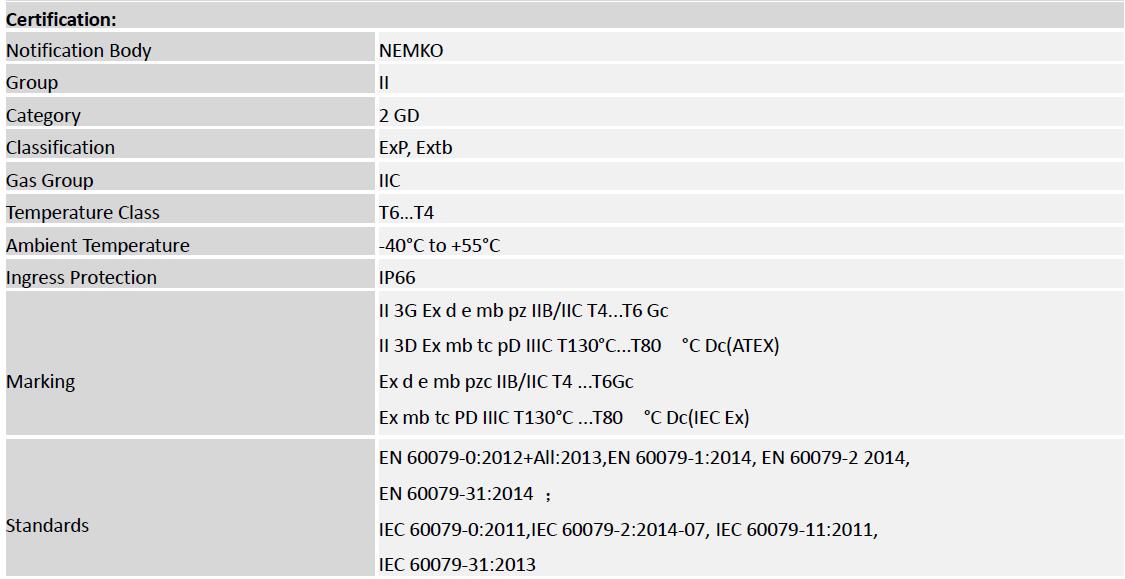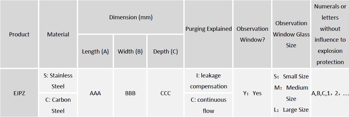 Type EJPZ Series Explosion-proof Pressurized Distribution Cabinetsconsists in pressurized enclosure and Ex p control unit. Thepressurized enclosure consists in a cabinet with different enclosuresizes as specified in the manufacturer document and apressurization system as associated apparatus. The pressurizedenclosure is of high quality carbon steel and stainless steel ,Usingthe sealing strip. The Ex p control unit type will be used to controland verify the minimum over pressure, to perform the purging of the enclosure, to control the purging andpressurization alarm.