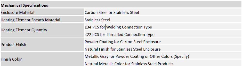 All our heaters are designed and manufactured according to customer's requirements andoperating conditions. The material carbon steel painted or stainless steel. Heatingelements material is stainless steel.