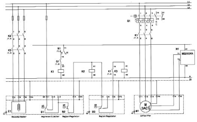 Wiring according to proposal as shown below. The motor of the ventilator must only be operated via a series-connected circuit breaker with proven tE-trip characteristic.
