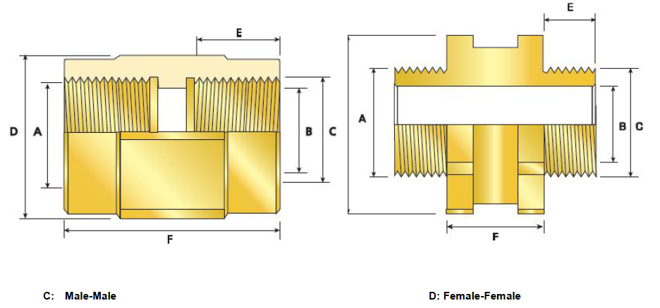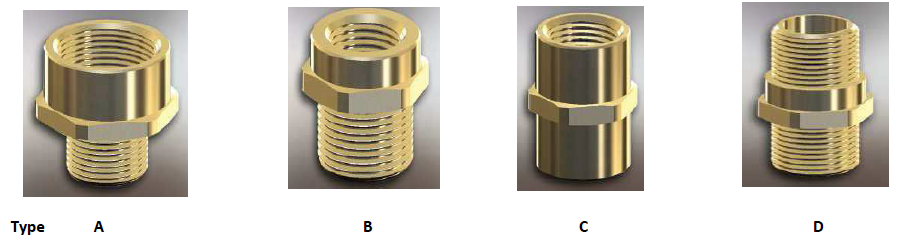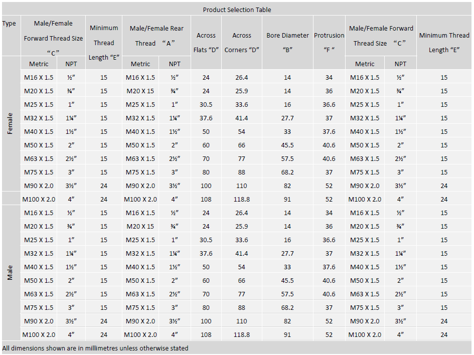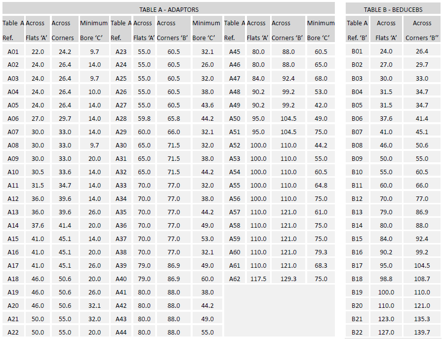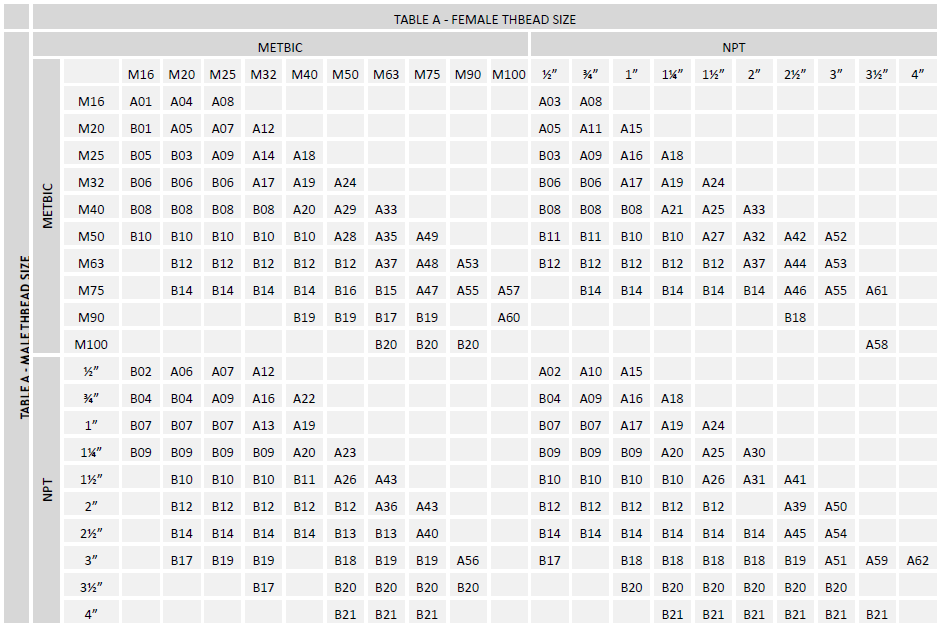 Select the female thread size from the top of Table ‘A’, referenced ‘A**’ for Adaptor and ‘B**’ for Reducer