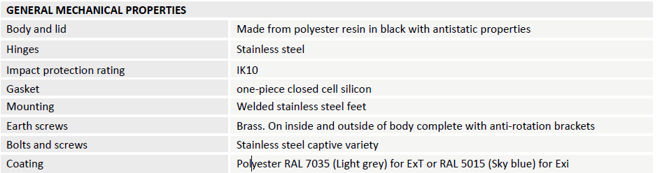 The enclosures can be drilled and taped with the maximum size and maximum number of holes as specified in the manufacturer documents for the use with separately certified cable glands or blanking plugs. Each enclosure is provided with an internal earthing certified terminal or earthing point. Metal enclosures are provided with an external earthing point.