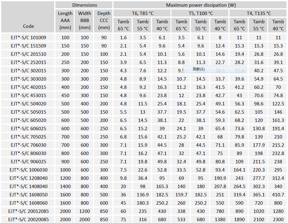 The enclosures may also be manufactured to intermediate sizes. This assumes that any given dimension is not larger than the respective dimension of the largest enclosure or smaller than the respective dimension of the smallest enclosure. The power rating applied to a enclosures of intermediate size is that of the next smallest enclosure.