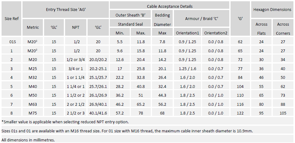 ? For use with single wire armour ‘W’, wire braid ‘X’, steel tape armour ‘Z’, elastomer and plastic insulated cables.